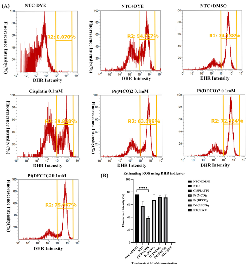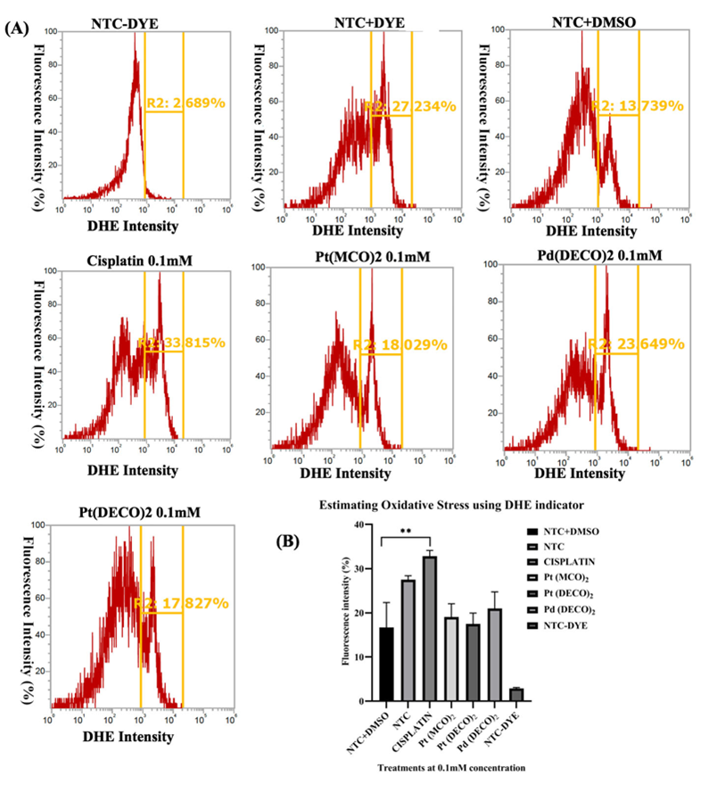 Figure 3: Measurement of superoxide levels using DHE. On the first day of the experiment, we seeded 50,000 cells per well onto a 24-well plate. The cells were then treated with metal cyanoximates for 24 hrs. On the third day, the cells were harvested for ROS analysis using the procedure described in the Materials and Method section. The cells were analyzed using Attune Nxt Flow cytometer at excitation and emission wavelength of 518nm and 606nm, respectively. A) A representative flow cytometer image of each treatment and the corresponding histogram gating used. Each treatment has exactly the same gating. Three replicates were used, but only one of the images is displayed. B) Analyzed data from Prism. * represents p < 0.05, ** represents p < 0.001, and *** represents p < 0.0002, and **** represents p < 0.0001.
