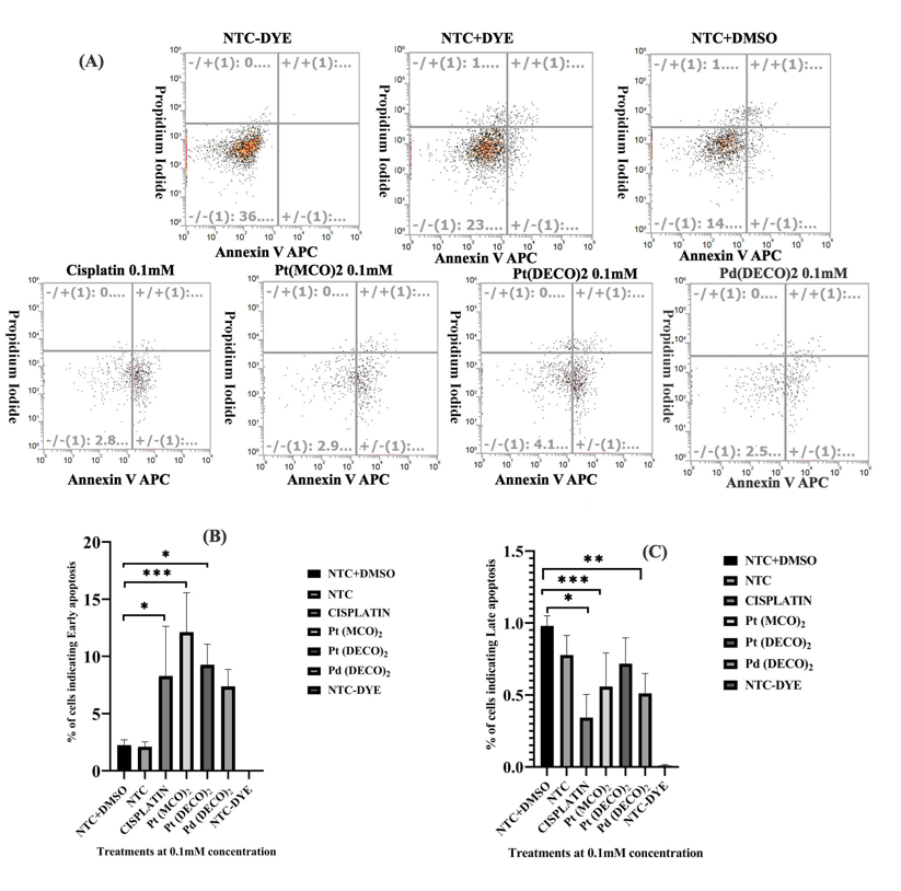 Figure 4: Measurement of HeLa cell death using Annexin V-APC and Propidium Iodide for early and late apoptosis, respectively. On day 1, 50,000 HeLa cells were seeded per well on a 24 well plate. The cells were then treated with 0.1 mM of metal cyanoximates for 24 hrs prior to collecting them for apoptosis measurements. On day 3, the cells were stained with Propidium Iodide and Annexin V-APC and were measured using a flow cytometer as detailed in the Materials and Method section. A) A representative flow cytometer image of each treatment and the quadrat gating used. The same gating was used for each treatment. The top left part of the quadrat shows necrotic cells, while the bottom left shows live cells. The top right quadrat shows late apoptotic cells, while the bottom right indicates early apoptosis. Three replicates were used, but only one of the images is displayed. B) Analyzed data after using Prism. Each bar represents the average of three replicates used with treatments showing early apoptosis. C) Analyzed data from Prism with treatments showing late apoptosis.* represents p < 0.05, ** represents p < 0.001, and *** represents p < 0.0002, and **** represents p < 0.0001.