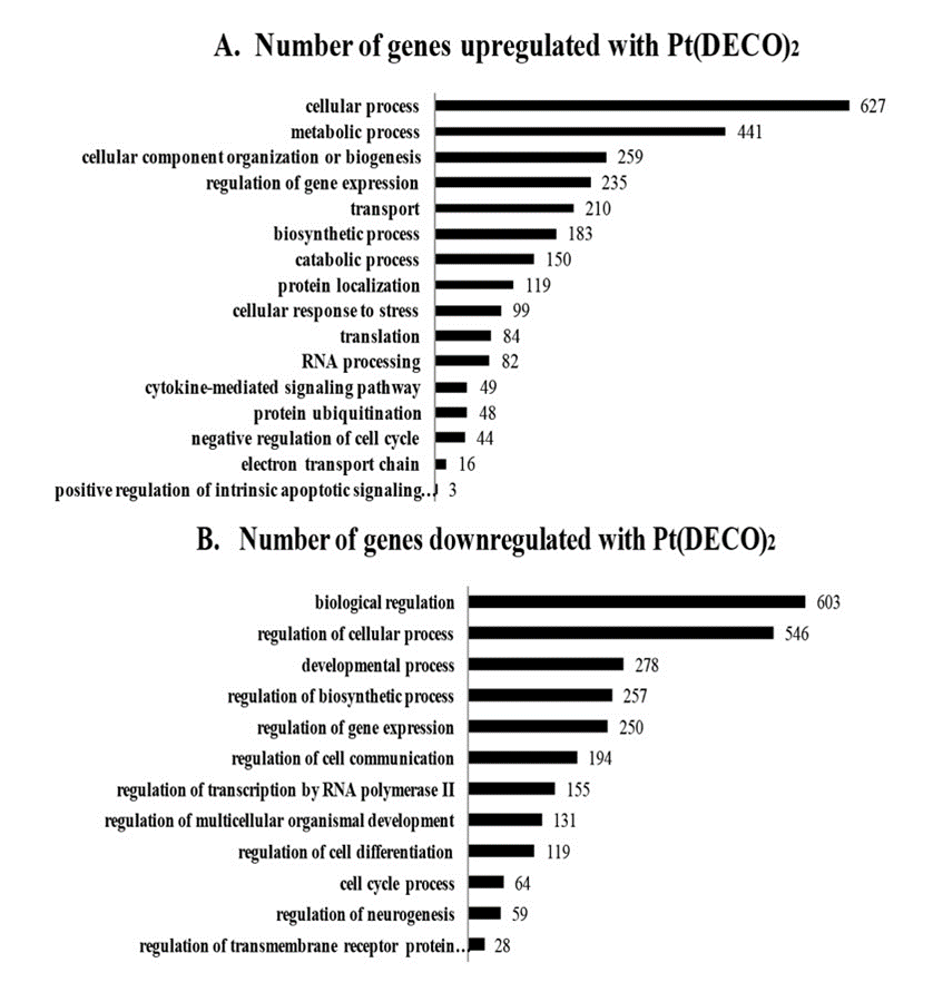 Figure 5: Gene Ontology terms of differentially expressed genes (DEGs) with Pt(DECO)2. All DEGs were grouped into clusters of GO terms shown in the figure. A total of 1,703 DEGs were found to be statistically significant with q value below 0.05. A) Among 1,703 DEGs, 869 genes were found to be upregulated. B) The quantification of downregulated genes associated with their specific GO terms. Of the 1,703 DEGs, 834 genes were found to be downregulated.