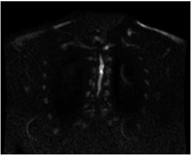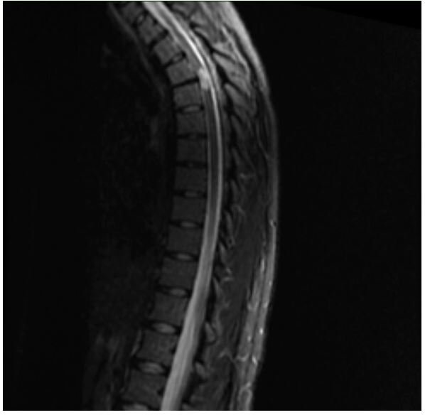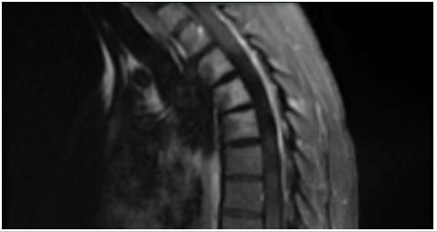 Figure 1: Initial MRI thoracic spine, DWI Image, showing enhancing cord abnormality at T3-T4 level suggesting possible nonspecific transverse myelitis.