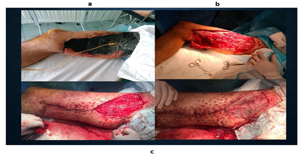 Figure 2: Extensive purulent-necrotic wound of the right thigh: a) installation of the VAC; b) the type of wound on the 14th day of the treatment; c) plastic closure of the wound..