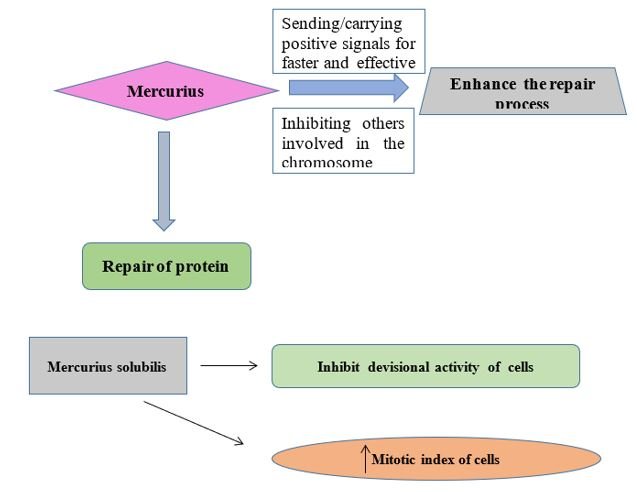 Mercurius solubilis action on genotoxic effects of mercuric chlorideMercurius chloride is an tremendously toxic salt and have tendency to cause chromosomal aberrations (damaging effect), micronuclei in the bone marrow cells (small chromatin- containing bodies arising from the chromosomes that failed to incorporate into daughter nuclei following mitosis) and increased frequencies of sperm head abnormality.