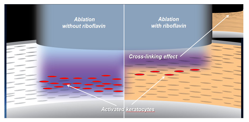 Figure 3:Photokeratoablation without and with saturation of the corneal stroma with riboflavin(diagram).