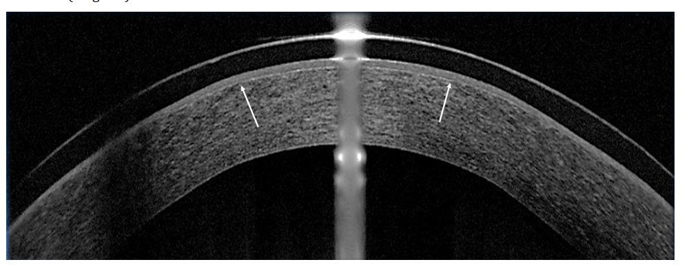Figure 4:Complete epithelialization under a contact lens 48 hours after TransPRK with riboflavin. In the ablation zone under the epithelium, a Bowman-like membrane structure is determined