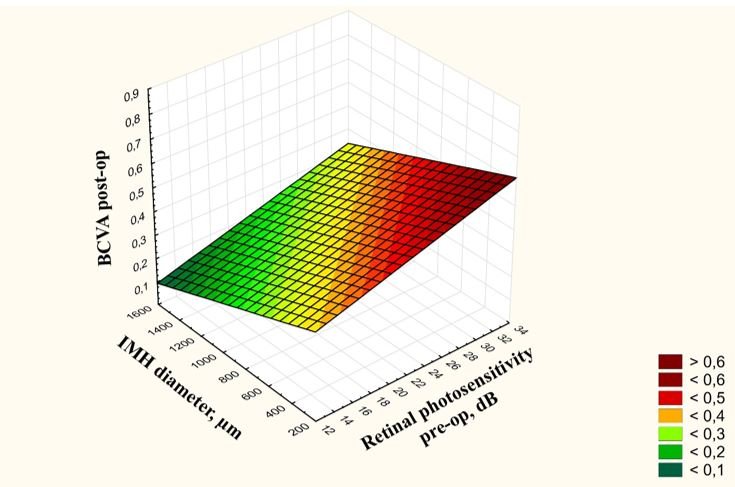 Results. After surgical treatment all patients showed a significant improvement in BCVA and retinal photosensitivity (p < 0.05). A formula was derived for the dependence of BCVA after treatment on the initial retinal photosensitivity and the maximal IMH size, which can be applied to predict the results of surgical treatment.