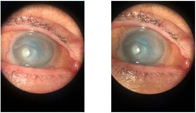 He entered the ophthalmology service on 03/31/2020, with a history of ocular hyperemia in his right eye for 15 days. The patient postponed the search for ophthalmological care due to the prescription of exposure and contagion by COVID-19 since at the time of care the city of São Paulo was at peak incidence of cases. Since, the patient has clarification of his increased risk being of risk group, being elderly and diabetic. Visual acuity in the right eye without luminous perception. She reported using eye drops of 1% prednisolone acetate and 0.5% moxifloxacin for 3/3 hours in the 48 hours before the appointment; associated with doxycycline 100 mg 12/12 hours orally together with the therapeutic contact lens, on suspicion of neurotrophic keratitis due to diabetes mellitus. Initial biomicroscopy showed corneal lesion 4 x 6 mm, stained with fluorescein, 3 x 3 mm, whitish, dense stromal infiltrate, reaching deep stroma, thinning in the region around 50% temporal and 30% central and conjunctival hyperemia 2 + / 4 +. Referred for culture collection, remaining 12 hours without using eye drops before, keeping only Doxycycline. Soon after, a fortified antibiotic was started (Vancomycin 50 mg/ml and Ceftazidime 50 mg/ml).