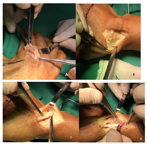 Figure 1: A. Dorsal incision at the level of the metacarpophalangeal joint where the synopsis encompassing the extender tendon is seen. B. Dorsolateral incision where the large synovitis of the wrist is observed. C. Tendon erosion (Long Thumb Extender). D.Exercise of the synovial lining the tendon (synoviectomy).