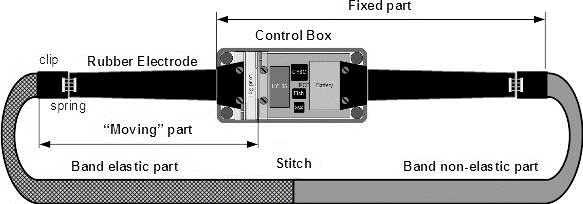 Chest strap sub-assemblies Chest circumference changes measurementThe changes in chest circumference modify the strain of the chest strap elastic part. The strain is measured by a 1kg bridge load cell and used as chest circumference equivalent.