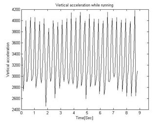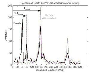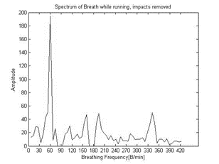 The vertical acceleration spectrum (Figure 7) identifies the spectral components of the running impacts on the breathing spectrum (Figure 7) and enables the signal processing algorithm to calculate the pelvic movement frequency as well and remove them both from the breathing spectrum (Figure 9).