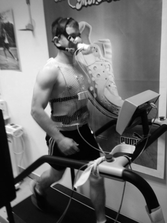 Figure 12: Male subject wearing the chest strap running on treadmill connected to the CPET.