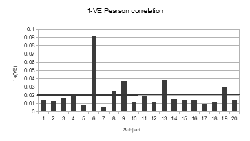 For better visual impression the complement values 1-rVE were used on a bar chart (Figure 14). It can be noticed that the majority of the VEe curves (n = 15) have a better correlation than the average, and only one test stands out with the highest value of 1-rVE[6]=0.091 for the lowest correlation (rVE[6] =0.909)